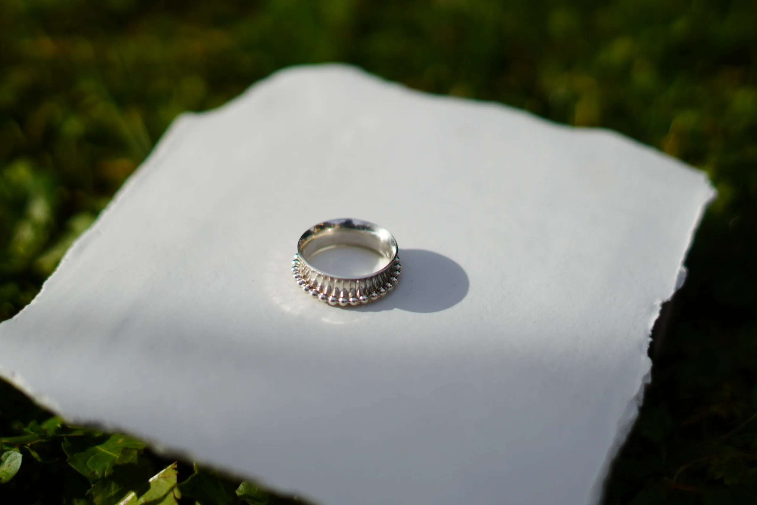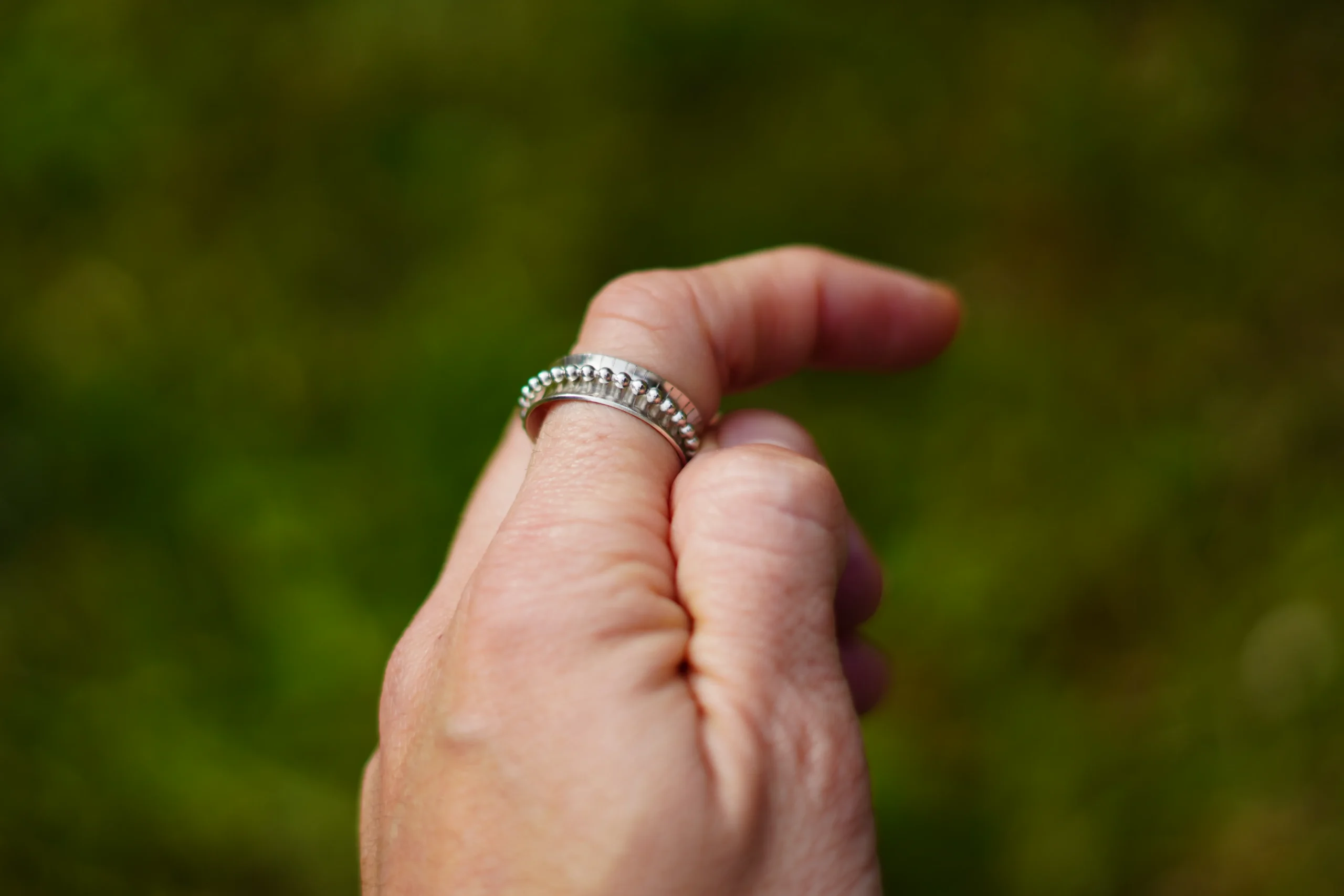 Creado artesanalmente en Barcelona, este anillo incorpora una fila de pequeñas bolitas que se pueden girar suavemente con los dedos. Su movimiento es fluido, silencioso y casi hipnótico. Te invita a detenerte, a reconectar contigo misma, a respirar profundamente cuando todo a tu alrededor va demasiado rápido.