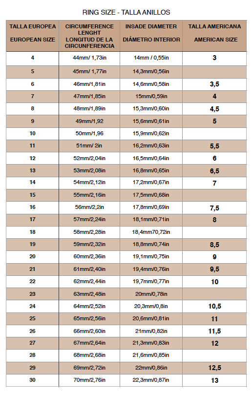 Para encontrar tu talla ideal, mide el diámetro interior de otro anillo que ya tengas (completamente redondo) y compáralo con la última imagen (columna 3). Para mayor precisión, mide también el dedo con una cinta métrica de papel y verifica que coincide con la columna 2. La talla para hacer el pedido es la talla europea, el número de la primera columna.